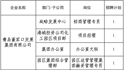 为满足集团业务发展需要,青岛董家口发展集团有限公司现面向社会公开招聘工作人员4名,具体招聘公告如下: